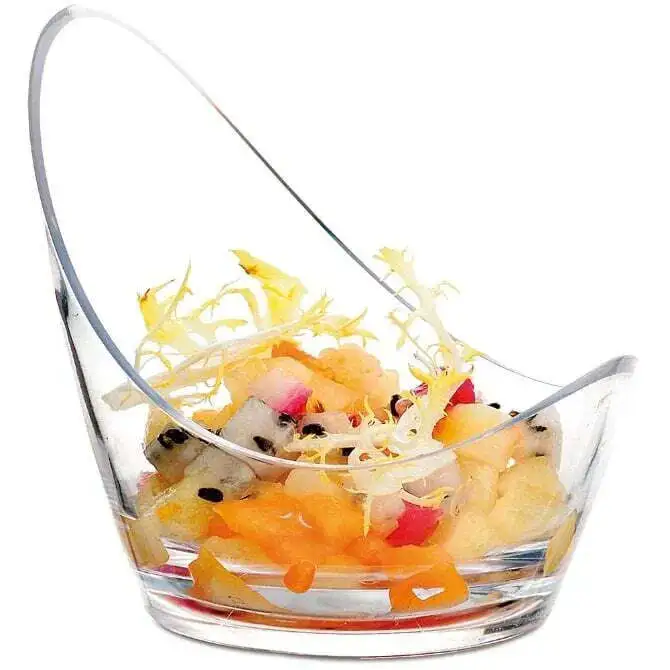 Platillo individual con forma de cuchara curva y borde elevado, ideal para canapés, salsas o degustaciones. Diseño minimalista y funcional.